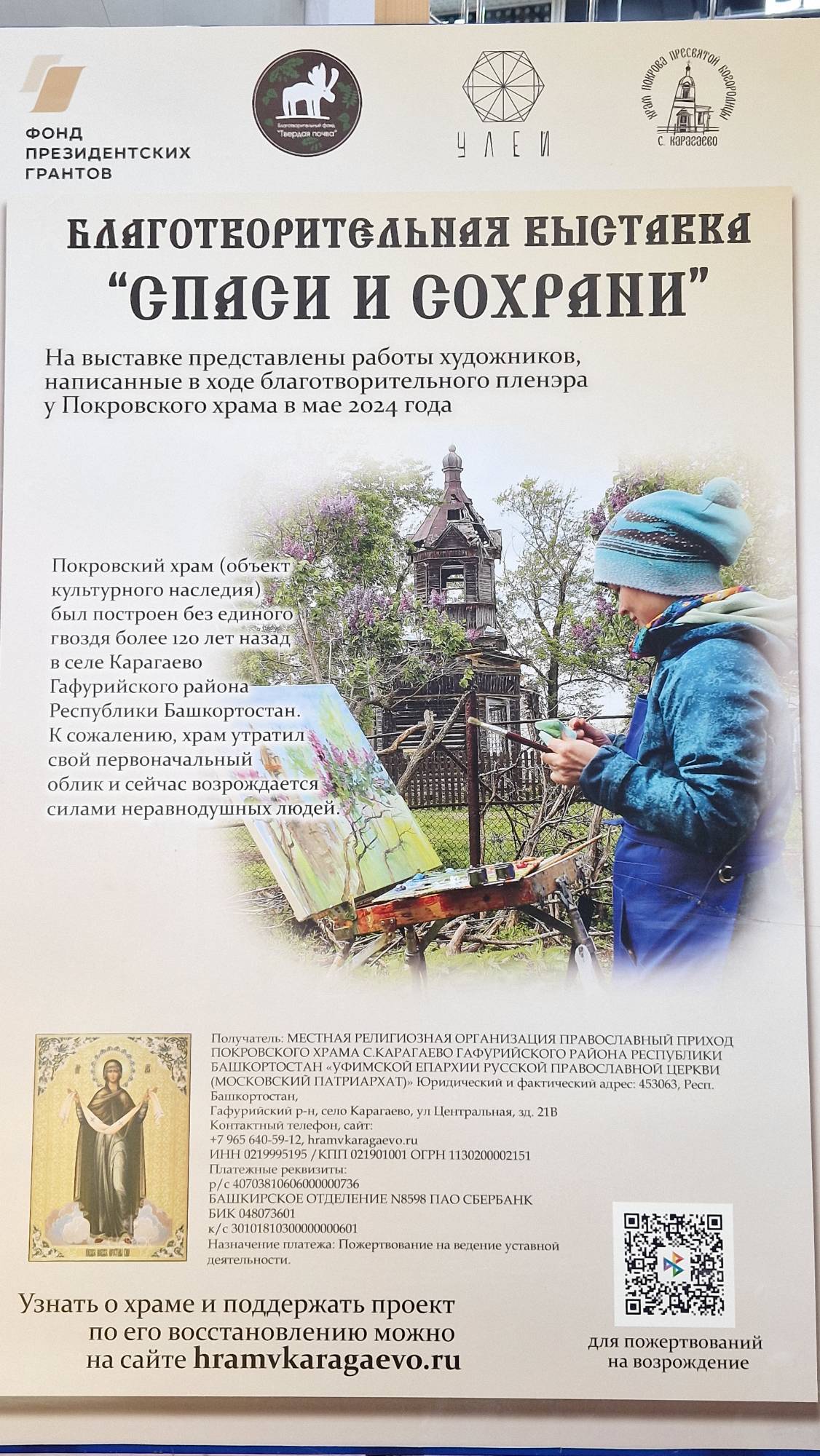 Выставка посвящена реконструкции Покровского храма в с.Карагаево Гафурийского района РБ.